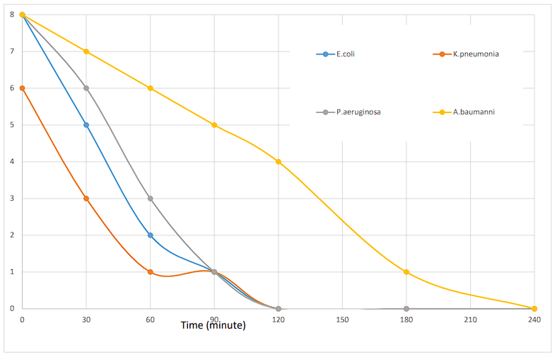 Logarithmic colony number graph of microorganisms changing over time under DLED.